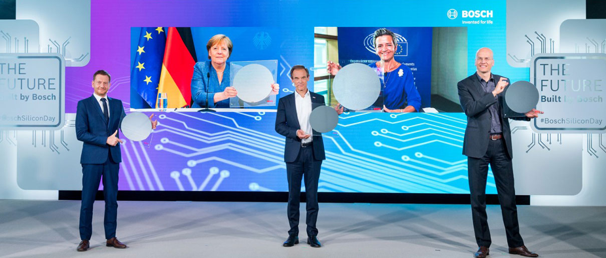Bosch inaugura en Dresde, Alemania, una de las fábricas de semiconductores más modernas del mundo. Máquinas altamente automatizadas y totalmente conectadas y procesos integrados, combinados con métodos de inteligencia artificial (AI), convertirán a esta planta en una fábrica inteligente y pionera en la Industria 4.0. En presencia virtual de la canciller alemana, Angela Merkel, la vicepresidenta de la Comisión Europea, Margrethe Vestager, y del ministro-presidente de Sajonia, Michael Kretschmer, esta localización se inauguró oficialmente el 7 de junio de 2021.