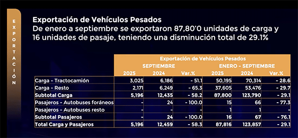 En cuanto a exportaciones, de enero a septiembre se enviaron 87,816 unidades de carga y 16 de pasaje, lo que implicó una reducción del 29.1%. En septiembre, las exportaciones sumaron 5,196 unidades, 58.3% menos que en 2024. Estados Unidos se mantiene como el principal destino, seguido de Canadá y Colombia. La exportación de vehículos diésel bajó 29.1%, los eléctricos 40% y los de gas natural 27.2%.