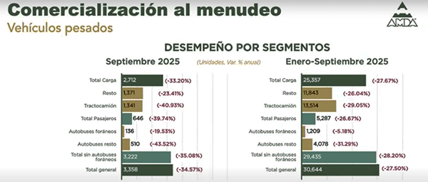 En cuanto al desempeño por segmentos, los camiones de carga retrocedieron 33.2% en septiembre; los tractocamiones, 40.93%; y el resto de camiones de carga, 23.41%. En autobuses, la caída fue de 39.74%; los foráneos disminuyeron 19.53%, y los urbanos, suburbanos, escolares y de personal, 43.52%. En lo acumulado del año, el segmento de carga retrocedió 27.67% y el de pasajeros 26.67%.