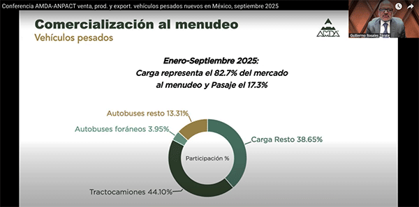 Rosales subrayó que el mercado mexicano de vehículos comerciales pesados no muestra señales de recuperación para el último trimestre del año. En los últimos 12 meses, de octubre de 2024 a septiembre de 2025, se han comercializado 46,668 unidades, 17.8% menos que en el ciclo anterior.