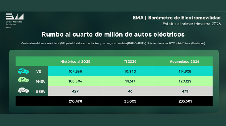 En el primer trimestre del año, las marcas afiliadas a EMA -que ofrecen en el mercado mexicano más de 110 modelos de vehículos eléctricos (VE) y 60 modelos de híbridos conectables y de rango extendido (PHEV + REEV)- alcanzan un acumulado histórico superior a las 235,000 unidades.