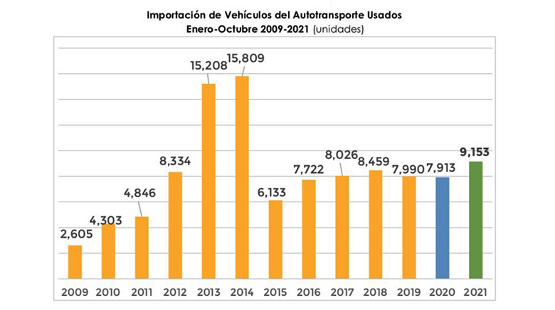 La Asociación Nacional de Productores de Autobuses, Camiones y Tractocamiones (ANPACT) dio a conocer que la importación acumulada de vehículos pesados usados de enero a octubre, alcanzó 9,153 unidades que comparadas con las 7,913 importadas durante el mismo periodo del 2020, significan un crecimiento 15.7%, haciendo de 2021 el año con el mayor número de vehículos pesados importados usados desde 2014 y el tercero más alto desde 2009.