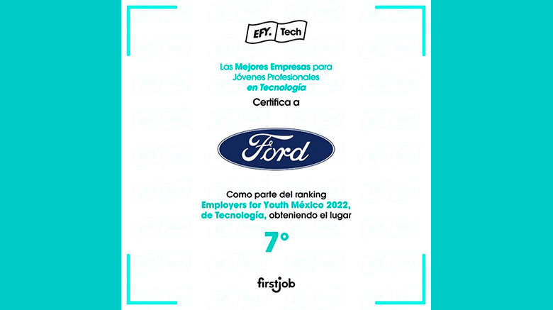 Ford Motor Company fue calificada como mejor empresa de tecnología según resultados del estudio Mejores Empresas en Tecnología para Jóvenes Profesionales en México 2022, de la empresa especializada en empleabilidad juvenil FirstJob.