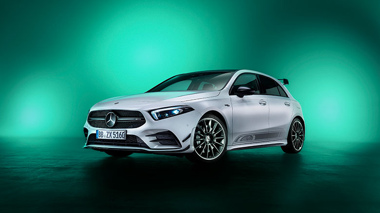 También se incluyen los modelos compactos de alto rendimiento A 45 4MATIC y A 45 S 4MATIC hatchback y sedán (WLTP: consumo combinado de combustible 9.1-8.7 l /100 km, emisiones combinadas de CO2 207- 198 g/km), y CLA 45 4MATIC y CLA 45 S 4MATIC como Coupé y Shooting Brake (WLTP: consumo combinado de combustible 9.1-8.5 l/100 km, emisiones combinadas de CO2 207-194 g/km). La pintura en tonos negro cosmos metalizado o blanco digital metalizado subraya el aspecto exclusivo, al igual que los rótulos con el emblema AMG tradicional y el rombo AMG, junto con los rines AMG de radios cruzados de 19 pulgadas.