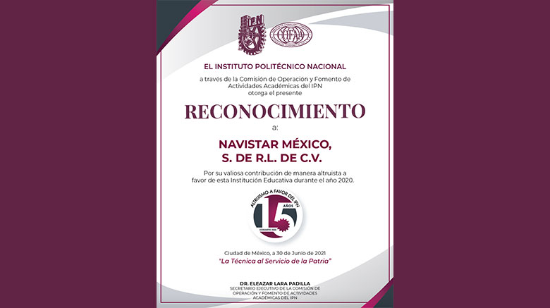 Navistar México fue reconocida por parte del Instituto Politécnico Nacional (IPN) por el donativo hecho por la empresa a esta institución educativa durante 2020.