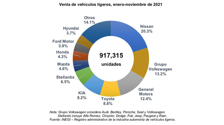 De acuerdo con las cifras publicadas por el INEGI, en noviembre de 2021 la venta de vehículos ligeros nuevos fue de 82,829 unidades, 13.5% menor al número de unidades comercializadas en noviembre de 2020. En el acumulado enero-noviembre de 2021 se registraron 917,315 vehículos ligeros nuevos vendidos, lo que representa un incremento de 8.6% con respecto a lo reportado durante el mismo periodo de 2020.