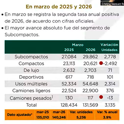 Sin embargo, al incorporar marcas que no están incluidas en el registro del INEGI, el tamaño del mercado en marzo se estima en 140,246 unidades, frente a 135,010 unidades en marzo de 2025, lo que implica un aumento de 3.9% anual.