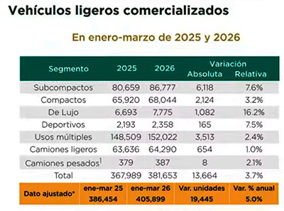Durante el primer trimestre del año, el mercado automotor alcanzó 381,653 unidades vendidas con datos oficiales del INEGI, es decir, 13,664 unidades adicionales respecto al mismo periodo de 2025, lo que representa un crecimiento de 3.7%. Al considerar las marcas fuera del registro estadístico oficial, el volumen total se elevaría a 405,899 unidades, con un avance anual cercano al 5%.