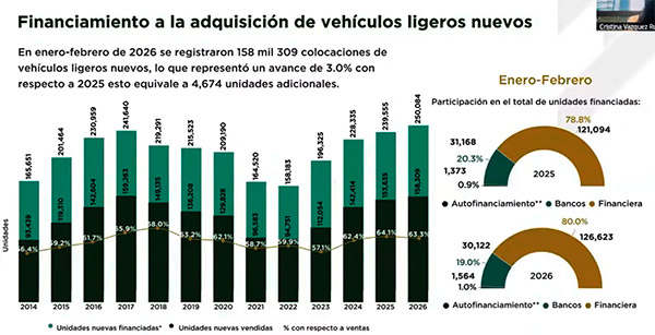 El financiamiento continúa siendo un factor clave para la adquisición de vehículos. En el primer bimestre de 2026 se colocaron 158,309 unidades mediante crédito, lo que representa un crecimiento anual de 3%.