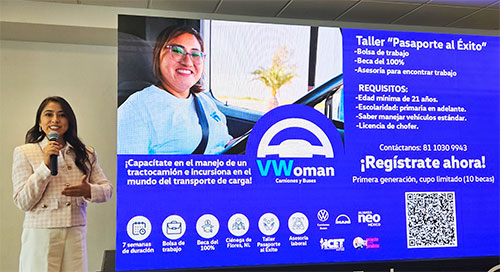Finalmente, sobre el programa llamado VWoman, Paola Moncada, dirigente de la Asociación de Mujeres Operadoras (AMO), resaltó que la iniciativa está promovida por Volkswagen Camiones y Buses para capacitar a mujeres en el manejo de un tractocamión y entrar así al mundo del transporte de carga en Monterrey, Nuevo León.